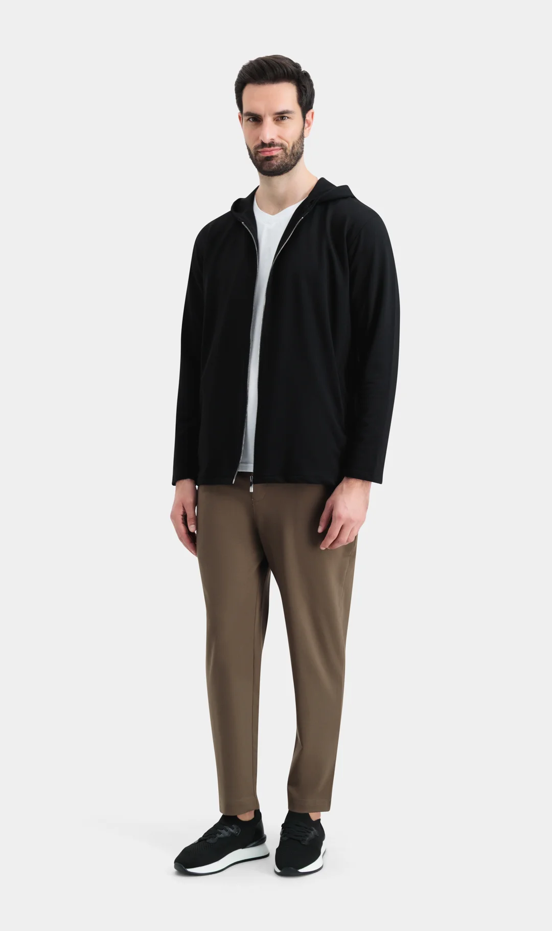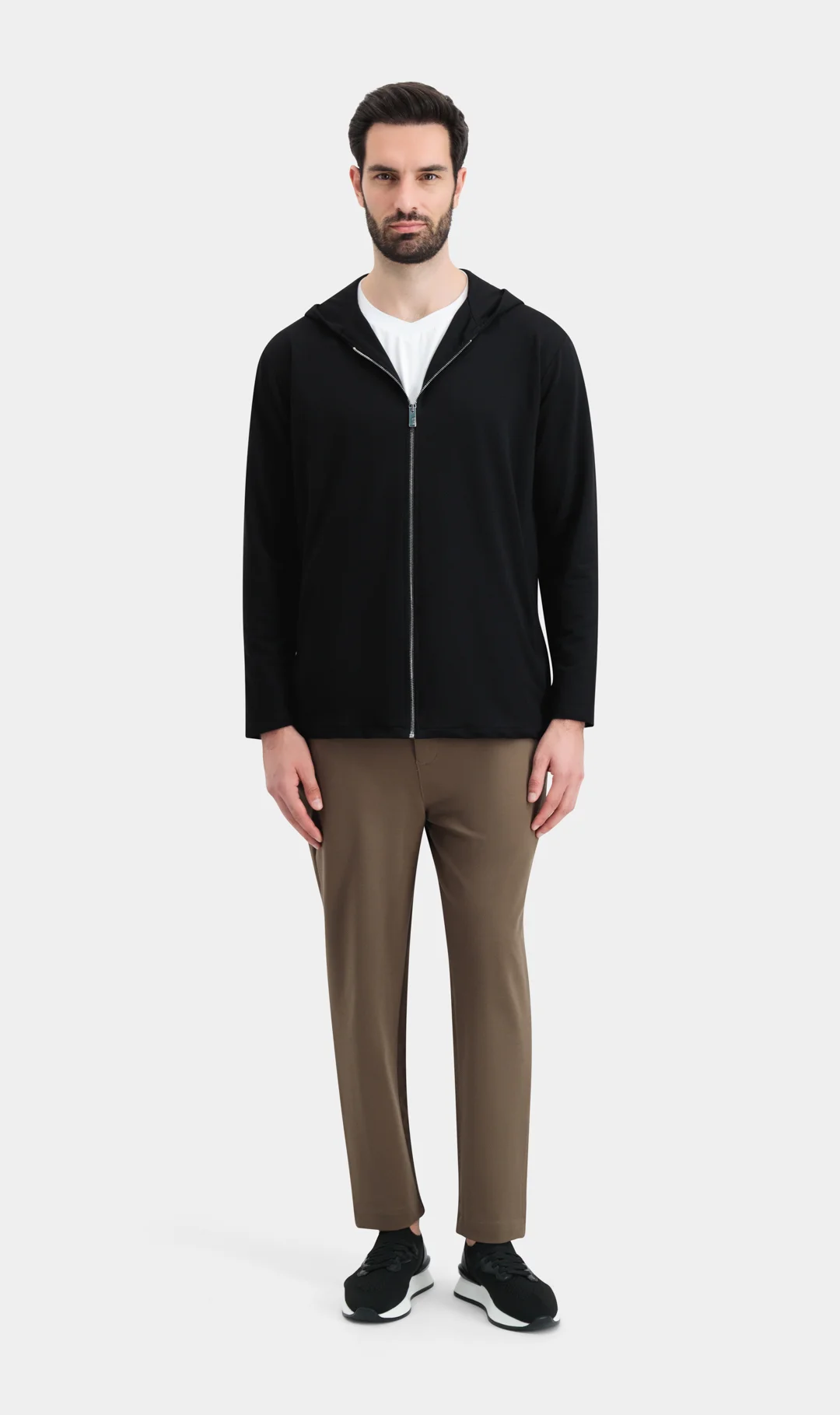 سترة طويلة من قماش مزدوج، قماش تيري، سحاب طويل من الأمام على الصدر، جيبان جانبيان، مقاس عادي، مساحة للتنسيق